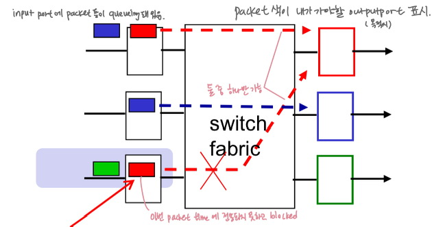 - input port queuing : 데이터그램이 switch fabric으로 forwarding rate보다 빨리 도착하는 경우 (switch fabric이 충분히 빠르지 않은 경우 buffer overflow로 인한 입력 큐잉 지연 or 손실) - switch보다 line으로 들어오는 게 더 빠르면 queuing이 일어난다.
