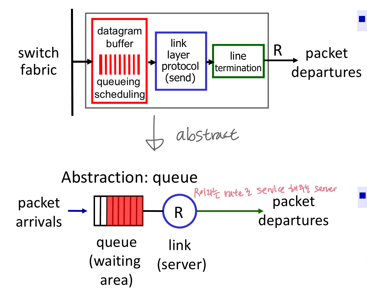 - output port : switching fabric의 speed와 outgoing link의 speed mismatch를 막기 위해 - 더 심각, 피하기 어려움. switching fabric이 굉장히 빨라서 link rate가 NR일 때 input port에서는 적재없이 한 번에 switching 기능.