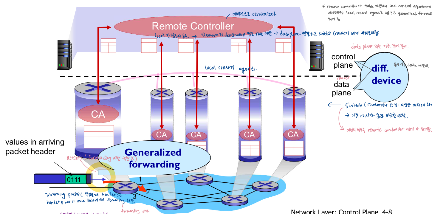 - software-defined 네트워킹(SDN) : (원격) 서버에서 구현 - > generalized forwarding 과 연관 (logically centralized-centralized server가 혼자 계산)