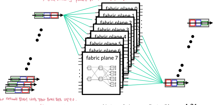 * multistage interconnection network 사용하면 여러 inputport로부터 packet이 다 들어왔다고 하더라도 동시에 switching fabric 통과할 수 O.