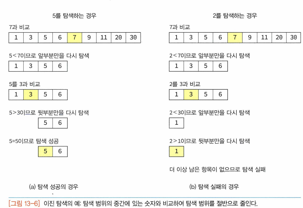 - 이진탐색: 배열의 중앙에 있는 값을 조사해서 찾고자 하는 항목이 왼쪽 또는 오른쪽 부분 배열에 있는지를 알아내어 탐색의 범위를 반으로 줄임 -> 매 단계에서 검색해야 할 리스트의 크기를 반으로 줄임