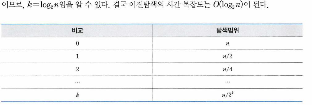 - 이진탐색: 탐색을 반복할 때마다 탐색범위를 반으로 줄임 -> 이러한 탐색범위가 더 이상 줄일 수 없는 1이 될 때까지의 탐색횟수 = k라 놨을 때, 표의 마지막 행에서 n/2^k=1이므로