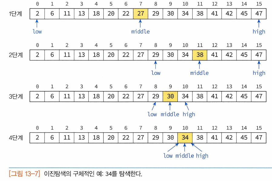 - 탐색의 대상이 되는 배열 : list[]. 탐색의 범위: low~high까지 함수의 매개변수 - 탐색에 성공하면 그 항목이 발견된 위치 반환, 그렇지 않으면 -1반환.
