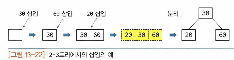 - 2개의 데이터값 저장 가능 -> 2-3트리에 데이터 추가시 노드에 추가할 수 있을때까지 데이터는 추가, 더 이상 저장할 장소가 없는 경우 노드 분리