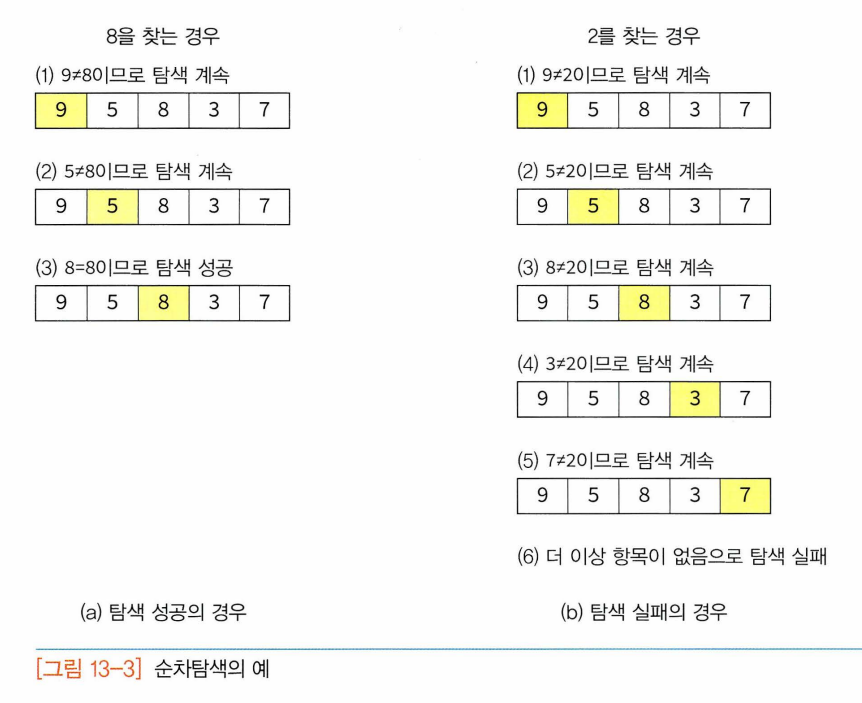 - 순차탐색에서 비교횟수 줄이는 방법 : 프로그램 13.1에서 리스트 전체를 탐색하기 위한 반복문에서 리스트의 끝을 테스트하는 비교연산이 있고 반복문 안에 키 값의 비교연산 있음 --> 리스트 끝을 테스트하는 비교연산을 줄이기 위해 리스트의 끝에 찾고자 하는 키 값 저장, 반복문의 탈출 조건을 키 값 찾을때까지로 설정하기