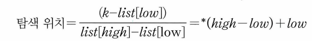 - 탐색위치 결정 : 찾고자 하는 키값과 현재의 low, high위치 값 고려하여 다음과 같이 탐색위치 결정