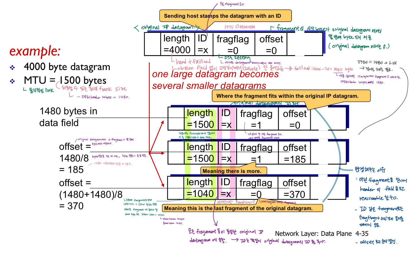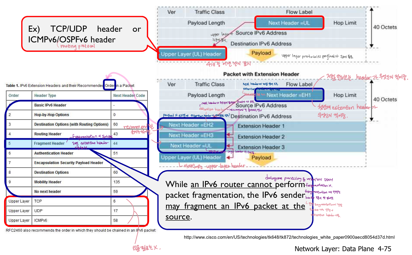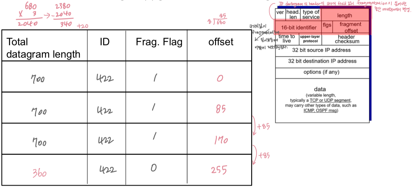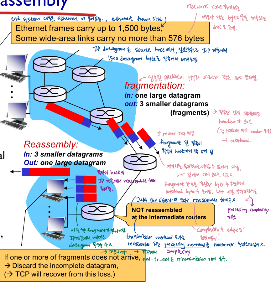 - 'IP header'을 사용하여 전송 계층에 도달하기 전에 router가 아닌 최종 목적지 "host"에서만 재조립됨.