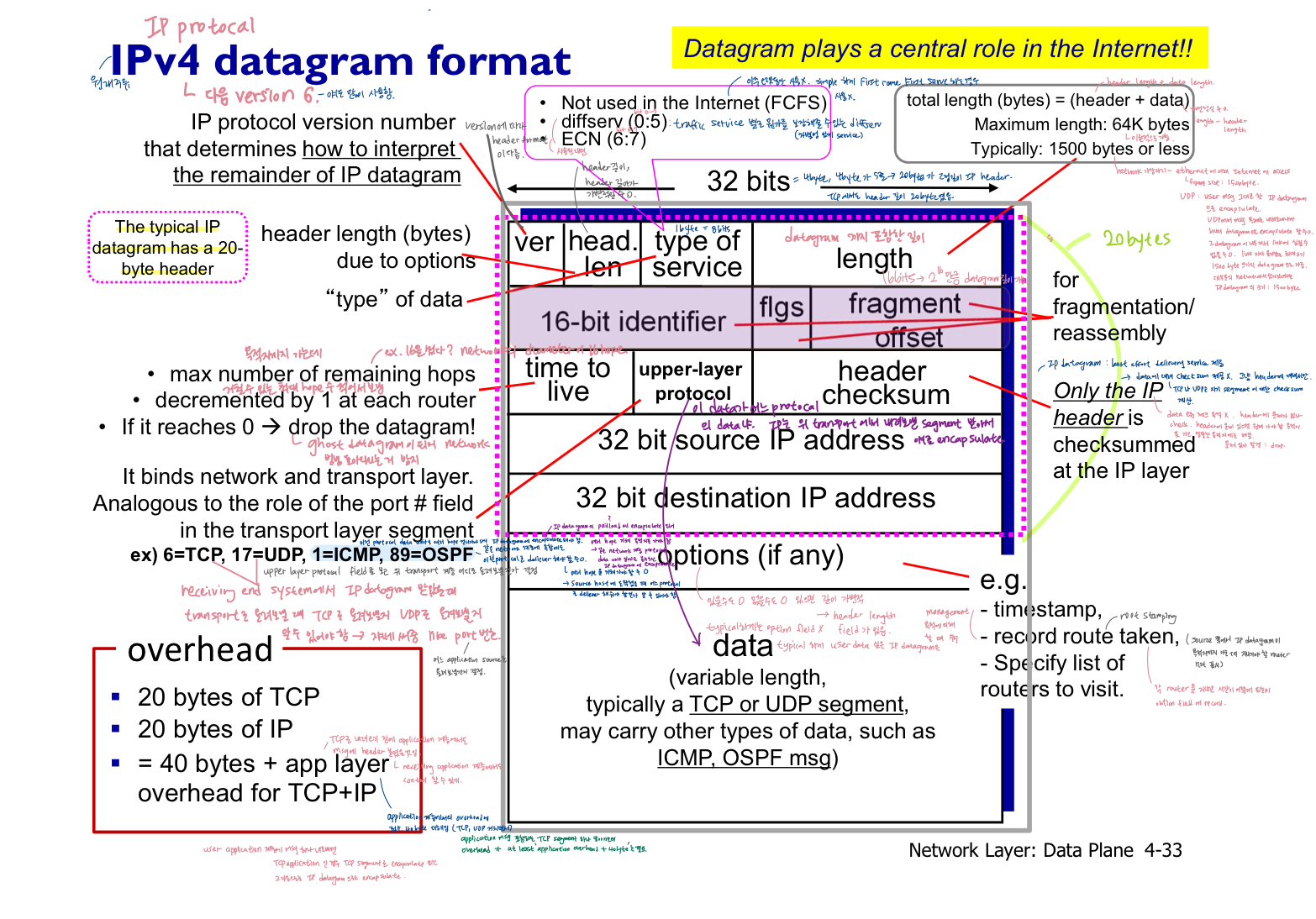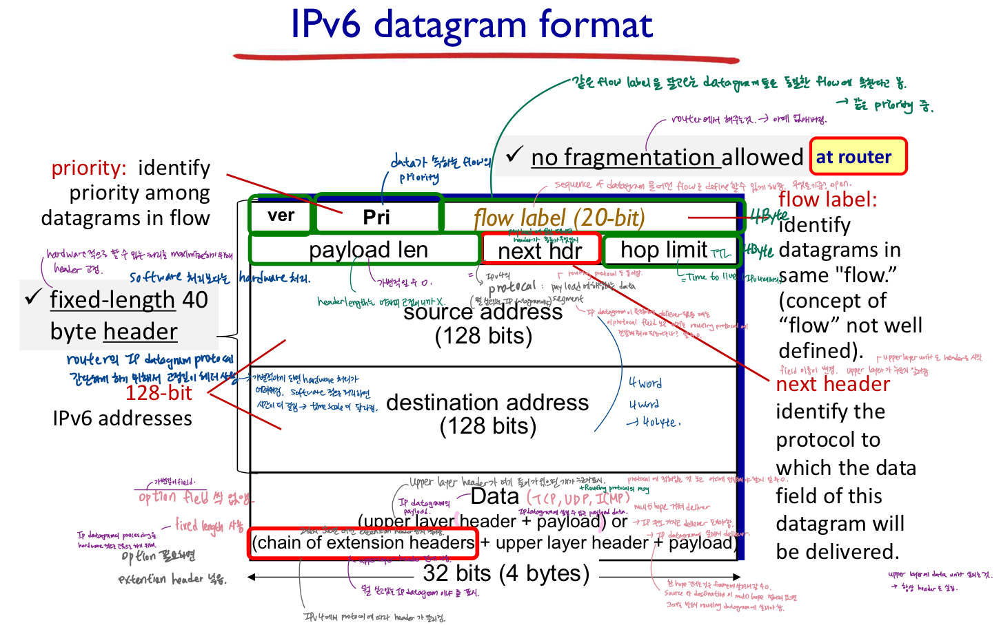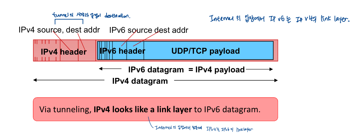 - 'IP header'을 사용하여 전송 계층에 도달하기 전에 router가 아닌 최종 목적지 "host"에서만 재조립됨.