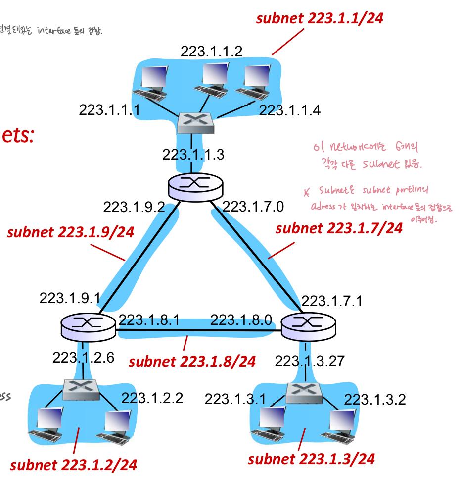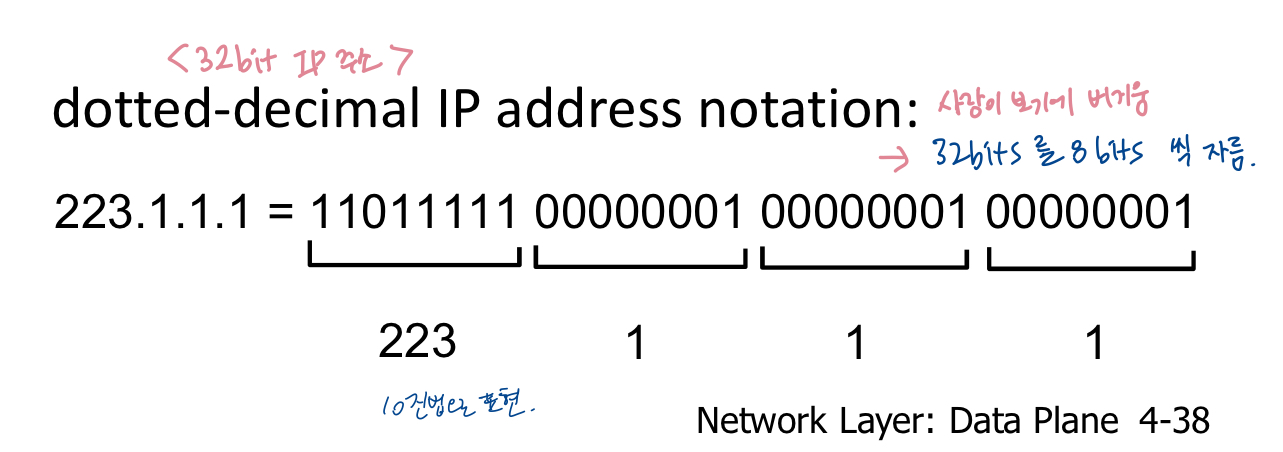 - IP adress : 각 호스트 또는 라우터 인터페이스와 연결된 32-bit 식별자