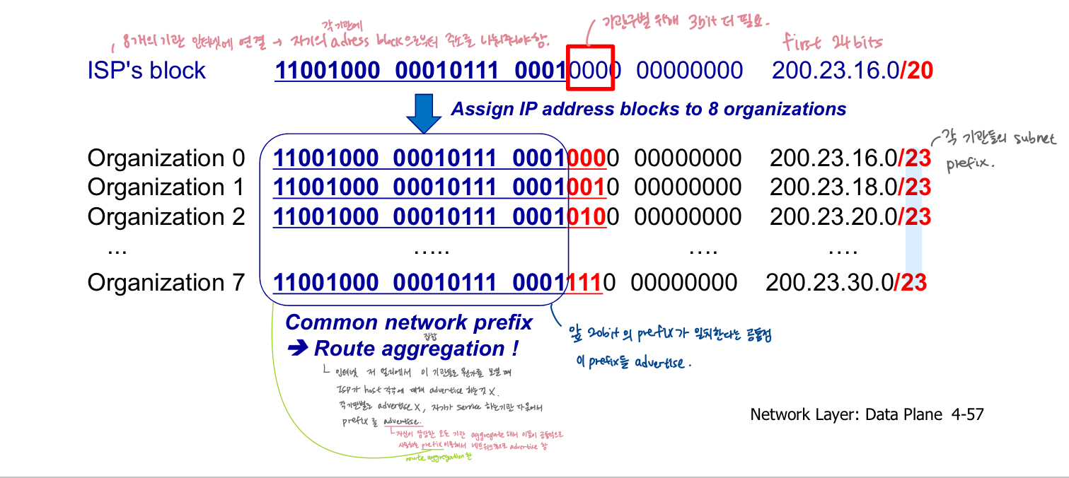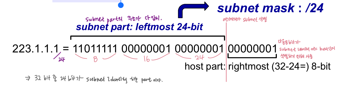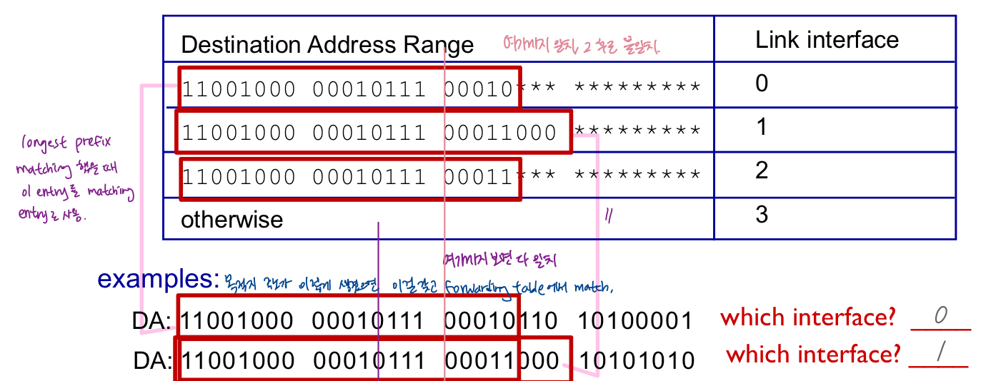 - incoming IP datagram의 destination IP adress를 forwarding table에서 찾을 때는 subnet portion만 보면 됨 -> 1st octet의 1st few bit만 보면 금방 subnet portion의 몇 bit까지인지가 결정