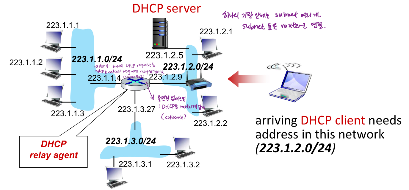 - 전형적으로 DHCP서버는 라우터에 함께 위치하여 라우터가 연결된 모든 서브넷에 서비스 제공