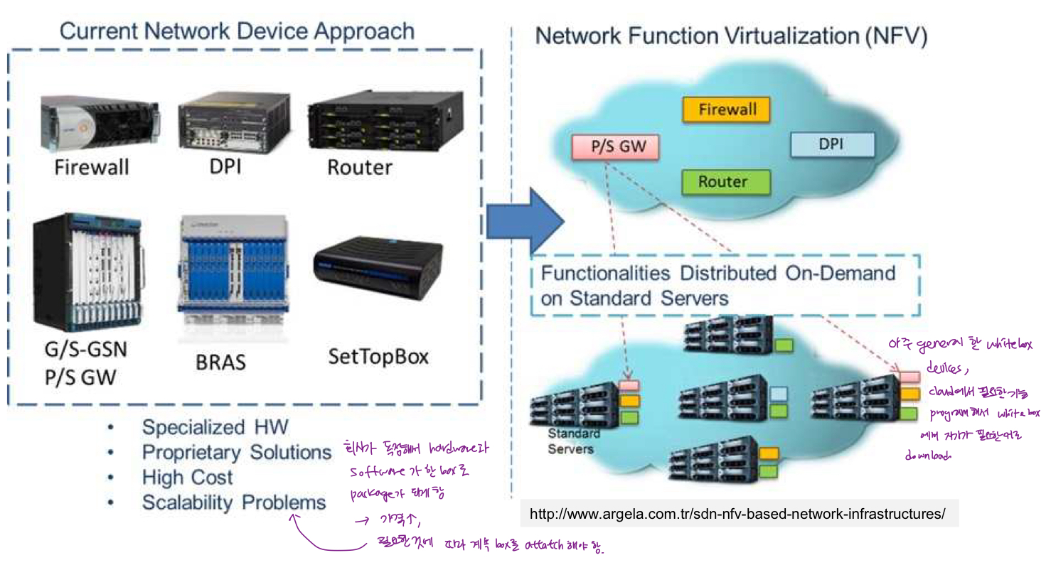 - 네트워크 기능 가상화(NFV)-SDN 등장하기 전 좀 더 general한 개념: over white box 네트워킹, 컴퓨팅, storage를 통한 프로그래밍 가능한 서비스 - whitebox에 서비스를 programmable하게 해 줌