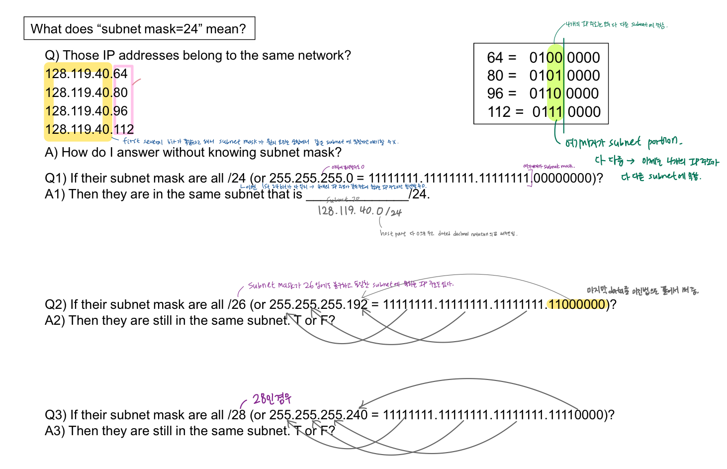 Q1) 서브넷 마스크가 /24일 때, IP 주소들이 동일한 네트워크에 속하는지 확인하려면, 첫 번째 세 개의 옥텟(128.119.40)은 동일하게 유지되어야 합니다.