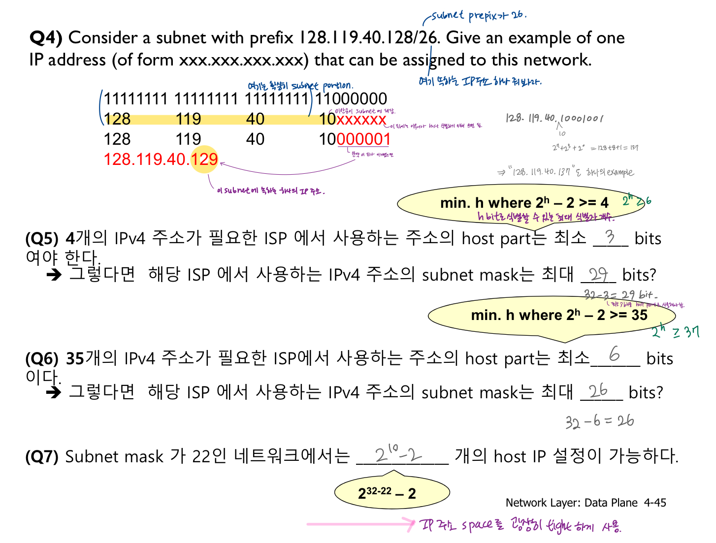 (1) 접두사가 128.119.40.128/26인 서브넷을 생각해보자. 이 네트워크에 할당할 수 있는 IP주소의 범위는?