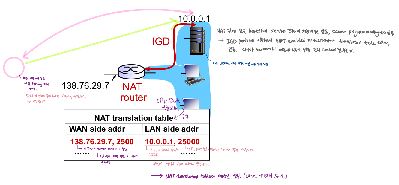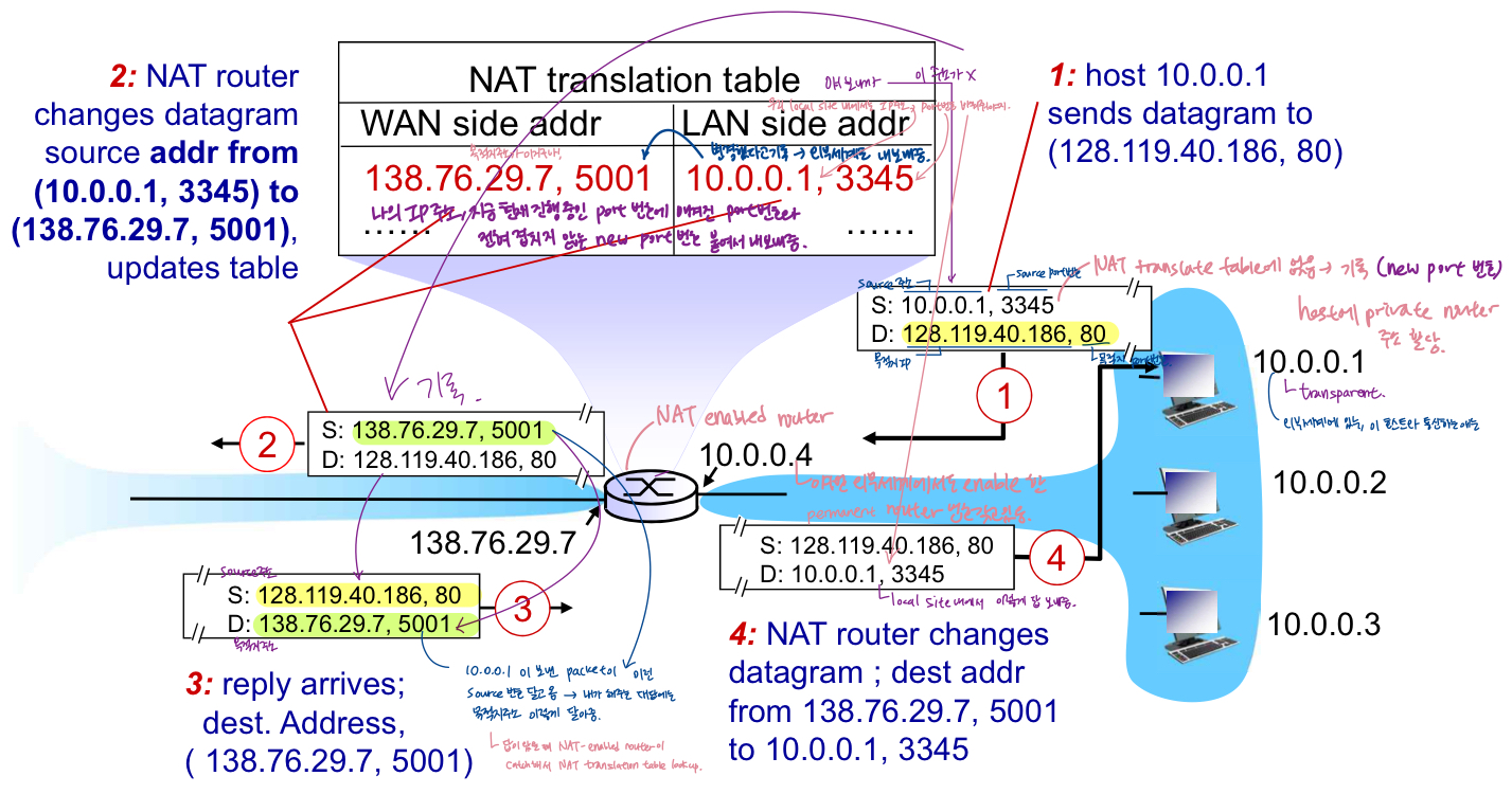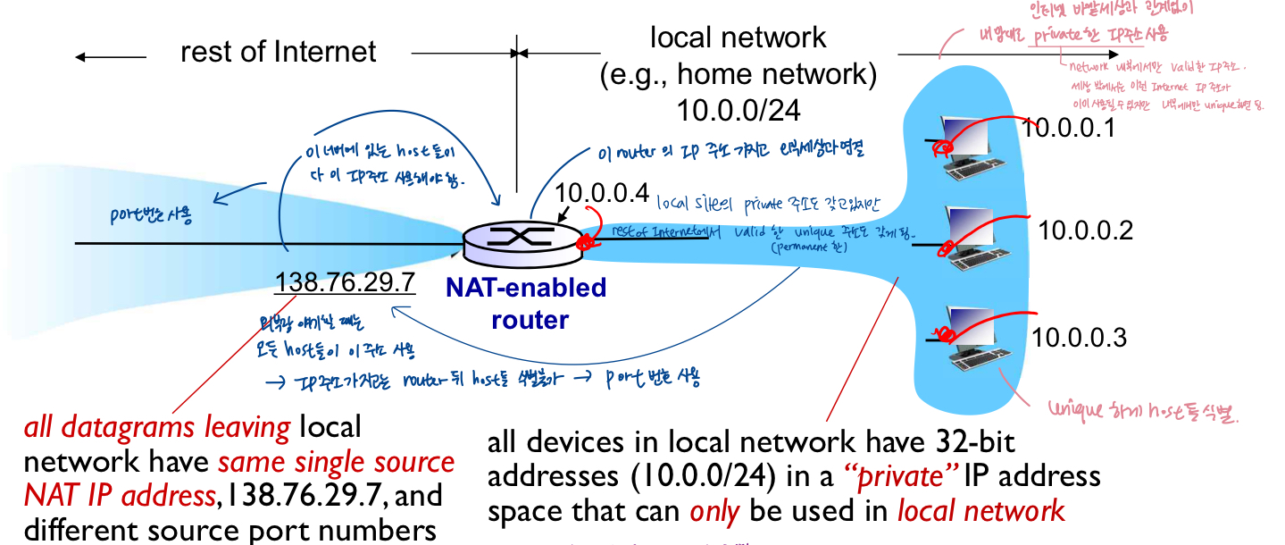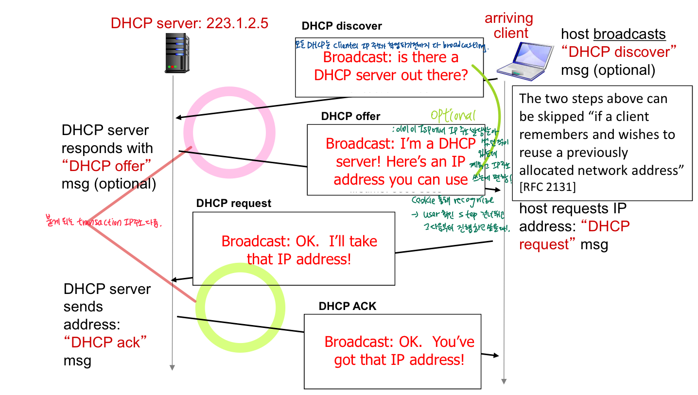 - IP주소 받아오면 일정 시간만큼만 사용할 수 O. 후에 다른 애한테 할당. 사용하고 나면 집 감 -> 집에서 또 새로운 IP주소 받음 -> 주소 reuse 가능(훨씬 많은 사용자 support <-> hard coding(그 주소는 이 인터페이스에 붙어있음)