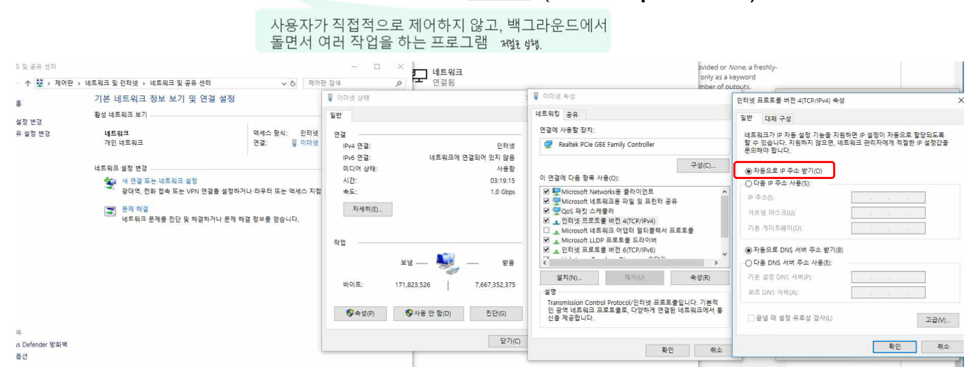 - Service/deamon[사용자가 직접적으로 제어하지 않고 백그라운드에서 돌면서 여러 작업 하는 프로그램(저절로 실행)]은 UDP(서버포트: 67)을 통해 실행된다.