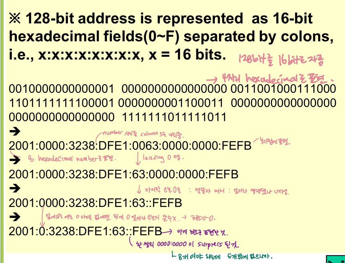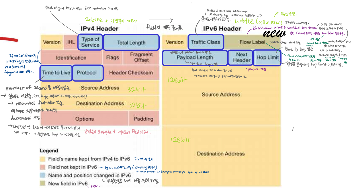 - move on하게 된 계기 : IP주소 space의 고갈. 여기서는 주소 bit가 32bit -> 128bit => 식별할 수 있는 interface의 개수 많음 (2^32 -> 2^128)