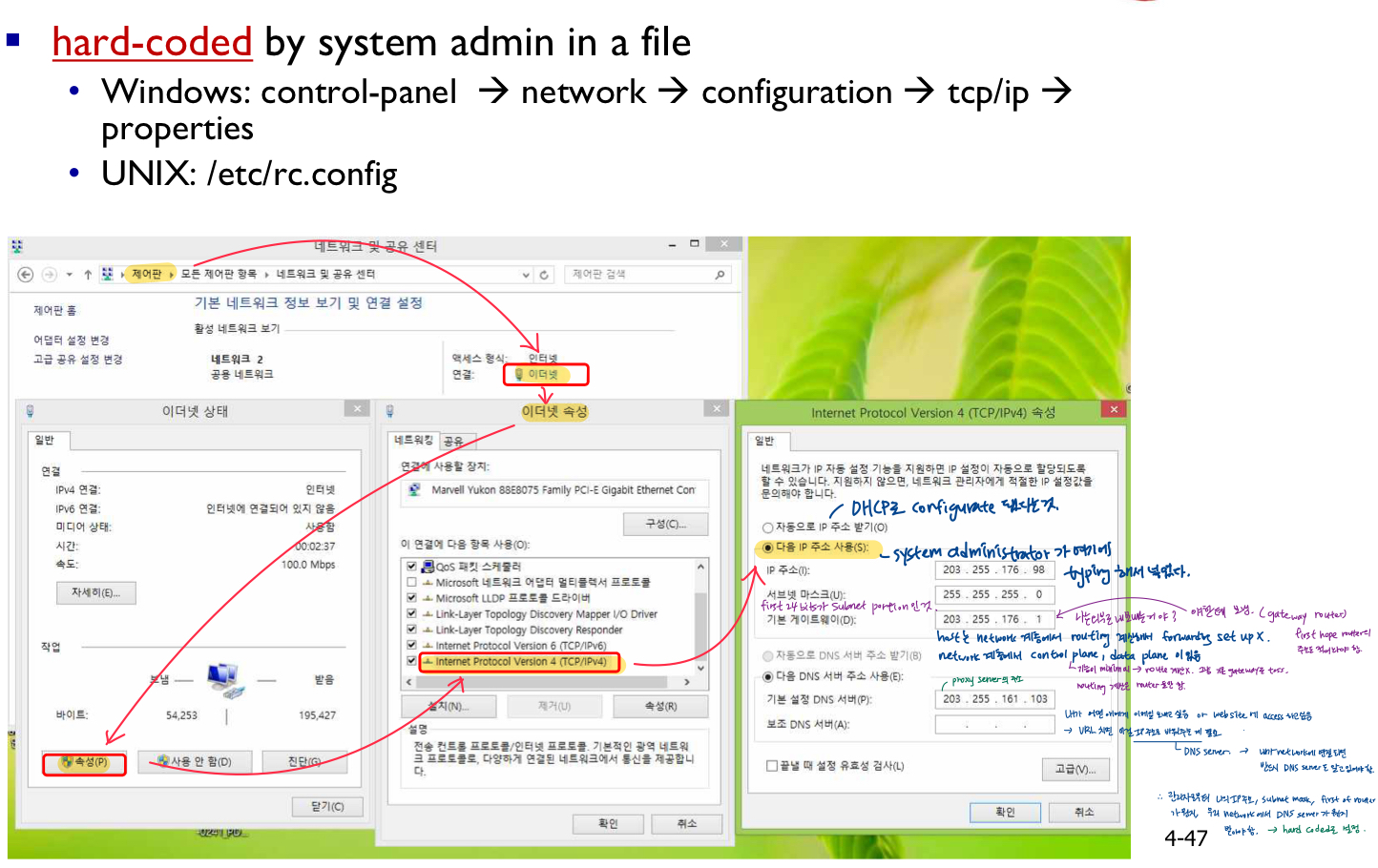 - DHCP : 동적 호스트 구성 프로토콜 : 서버에서 동적으로 주소 가져오기 - 내가 IP주소가 필요하면 동적으로 server(관리자)에서 받아옴 -> 하드코딩하는 것이 아닌 DHCP program 구동돼서 DHCP server로부터 dynamic하게 내가 쓸 IP주소 받아와서 설정.