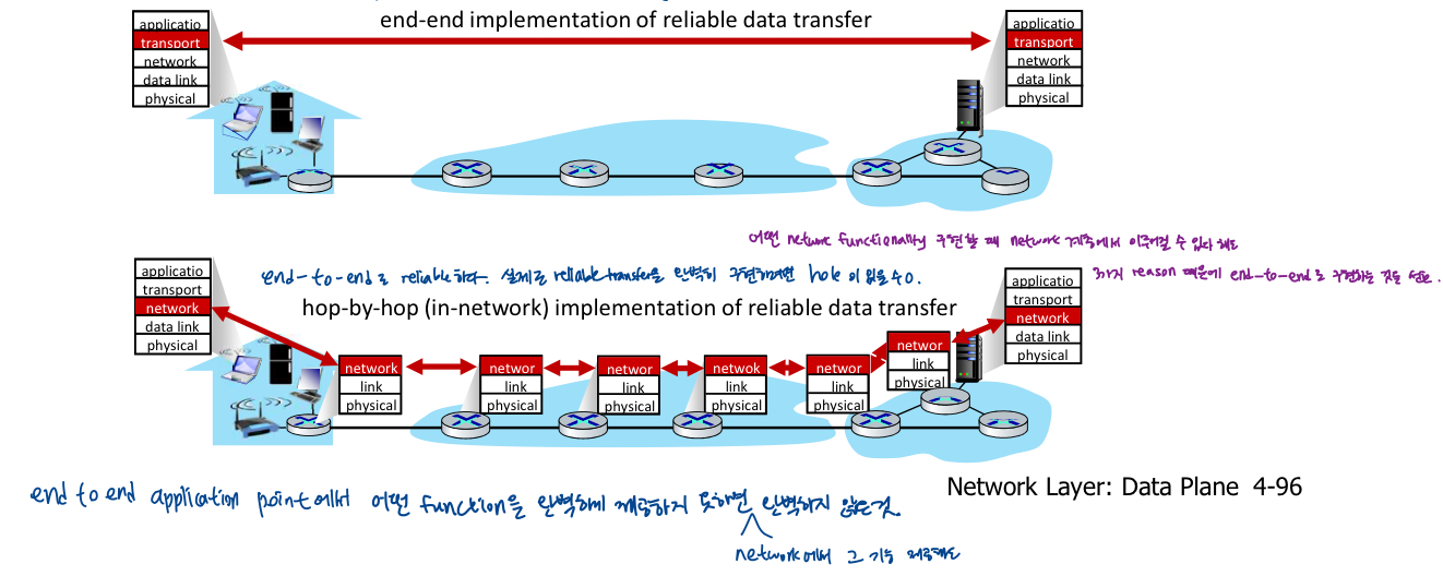 - 일부 네트워크 기능(ex. 안정적인 데이터전송, 혼잡)은 네트워크 또는 네트워크 edge에서 구현 가능-미들박스도 실제로 네트워크 edge에 달리는 경우 많음), 원한다면 네트워크 내, 네트워크 edge에서 구현될 수 있음, 대부분의 것은 end-to-end에서 구현(많은 복잡한 기능 해결)