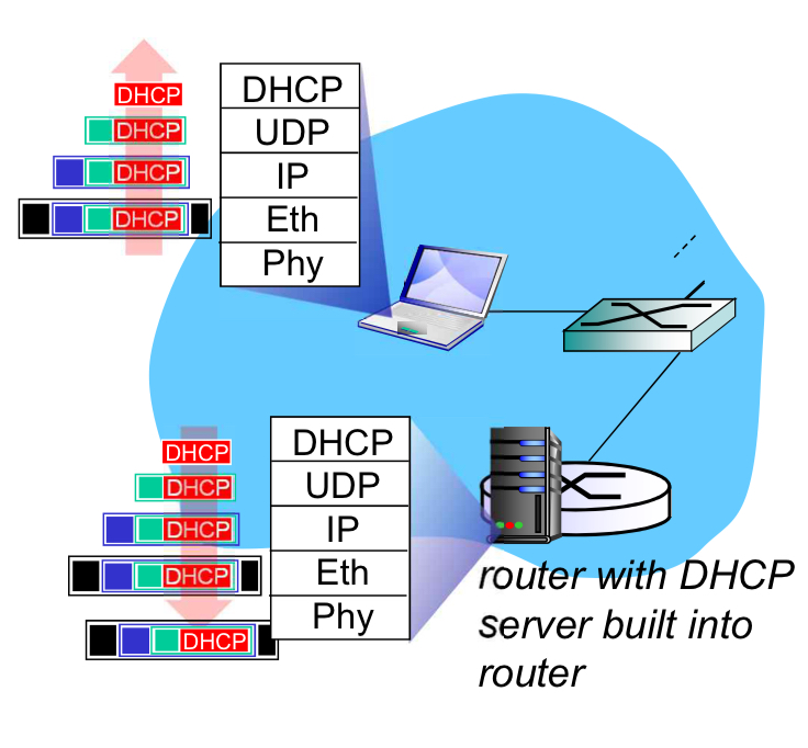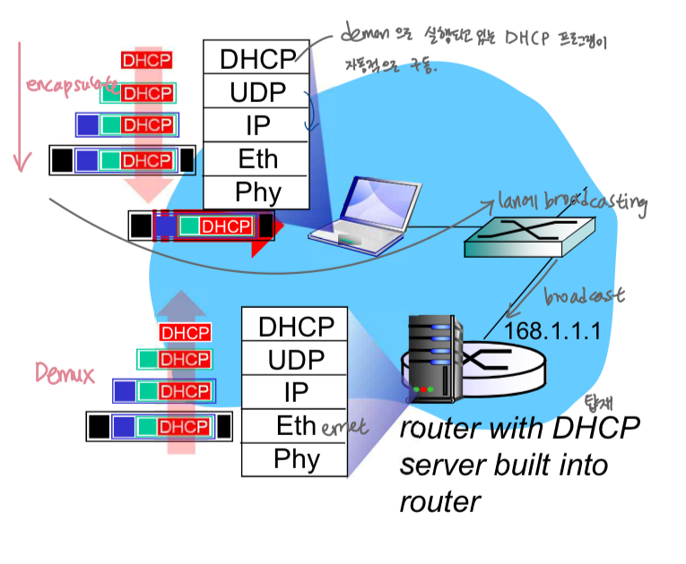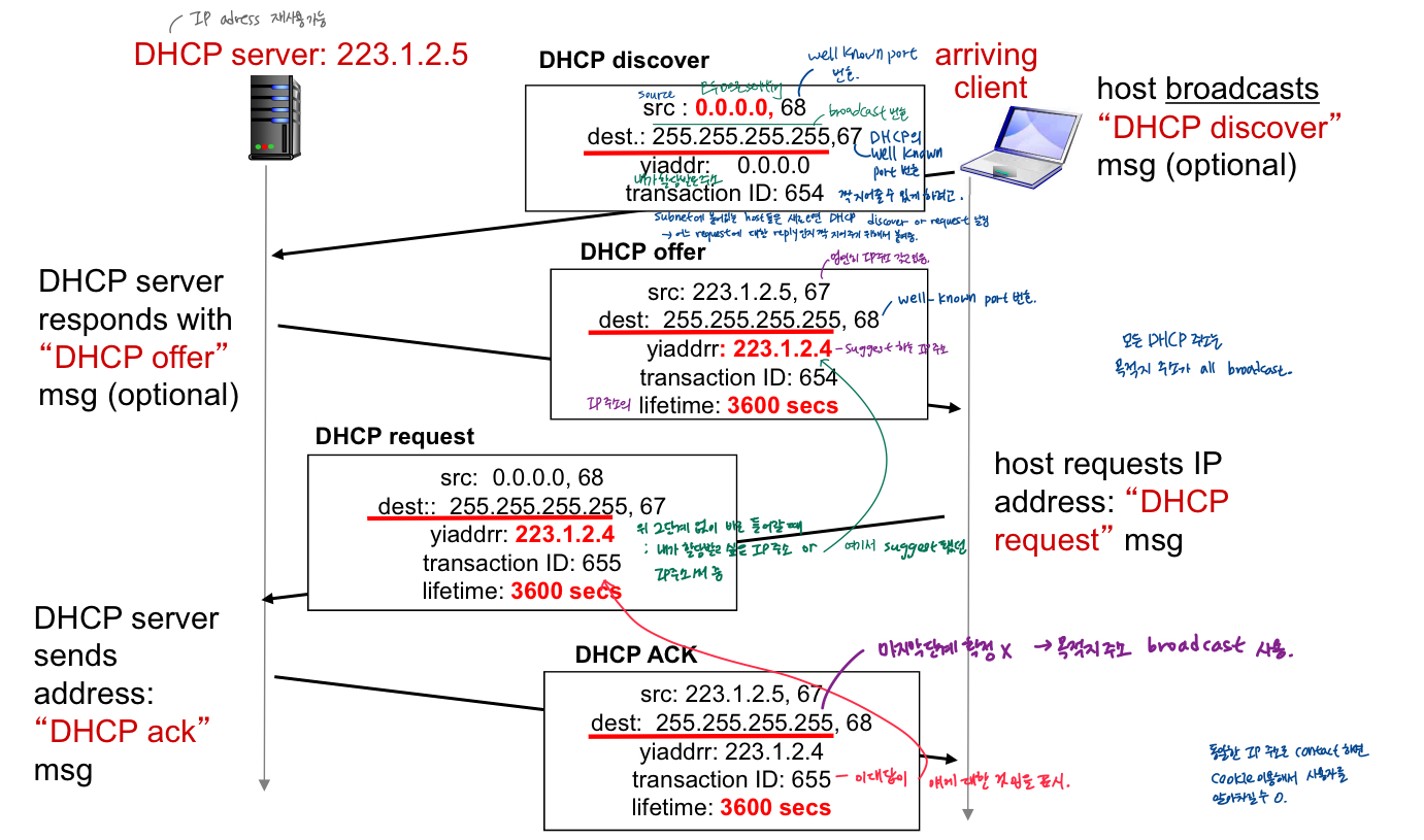 모든 DHCP msg는 목적지주소가 다 broadcast - 모든 DHCP client-server interactional 완성될때까지(완성돼야 host가 그제서야 IP주소 할당받음)