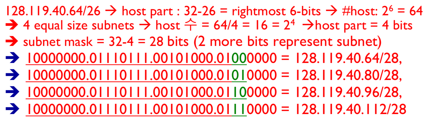 - 128.119.40.64, 128.119.40.80, 128.119.40.96, 128.119.40.112는 각각 다른 /26 서브넷에 속합니다.