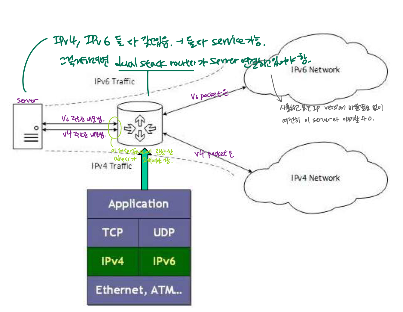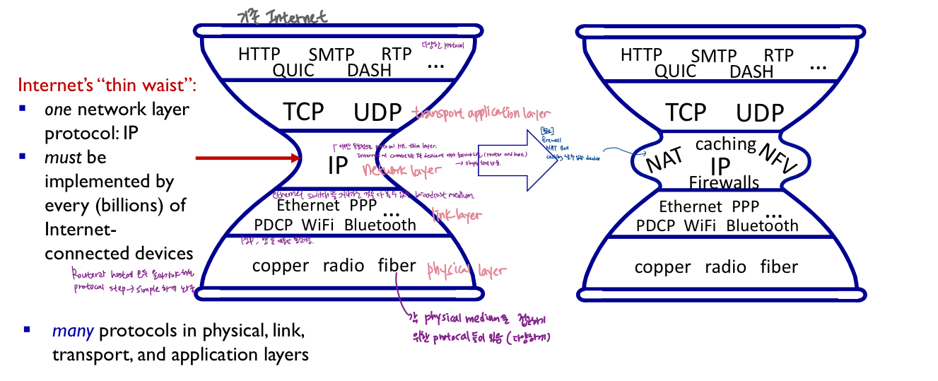 - IP는 네트워크 코어의 라우터에도 올라가는 프로토콜 계층 -> IP에 변화가 오면 painful