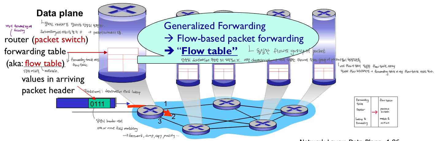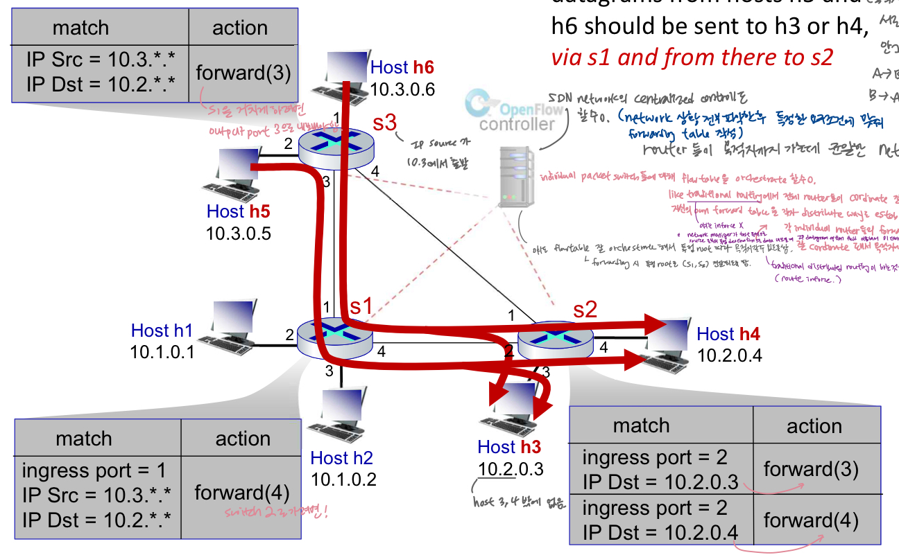 - SDN network의 centralized controll도 할 수 o. (네트워크 상황 전부 파악한 후 특정한 요구조건에 맞춰 forwarding table 작성), router들이 목적지까지 가는데 균일한 network 필요