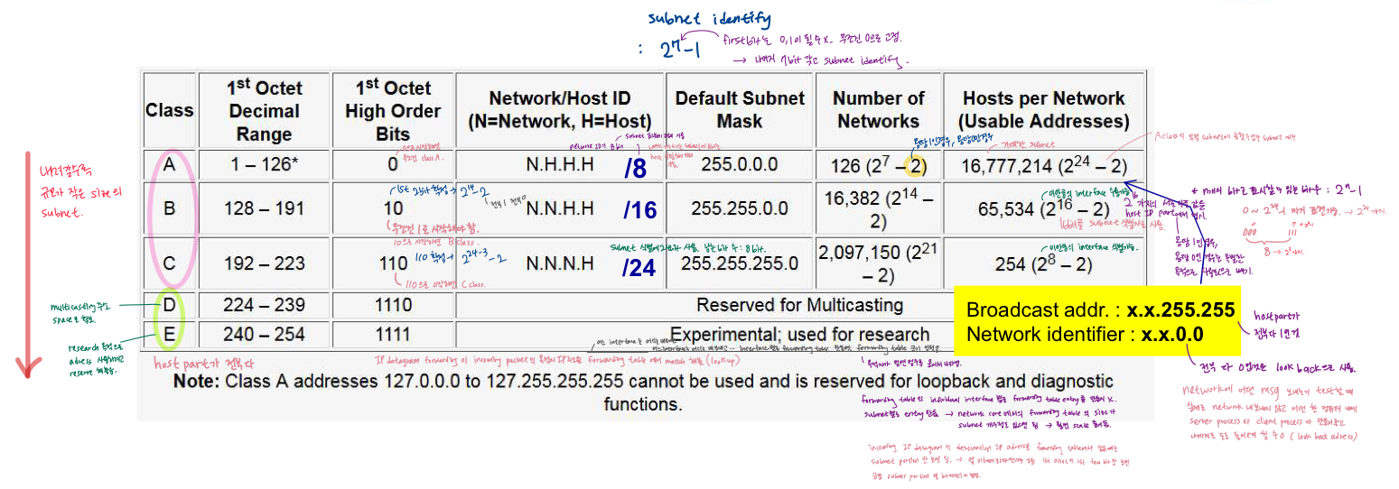 - 처음에는 classful adressing 사용: 1st Octct의 high order bit를 가지고 어느 class에 속하는 IP 주소인지 쉽게 판단 가능