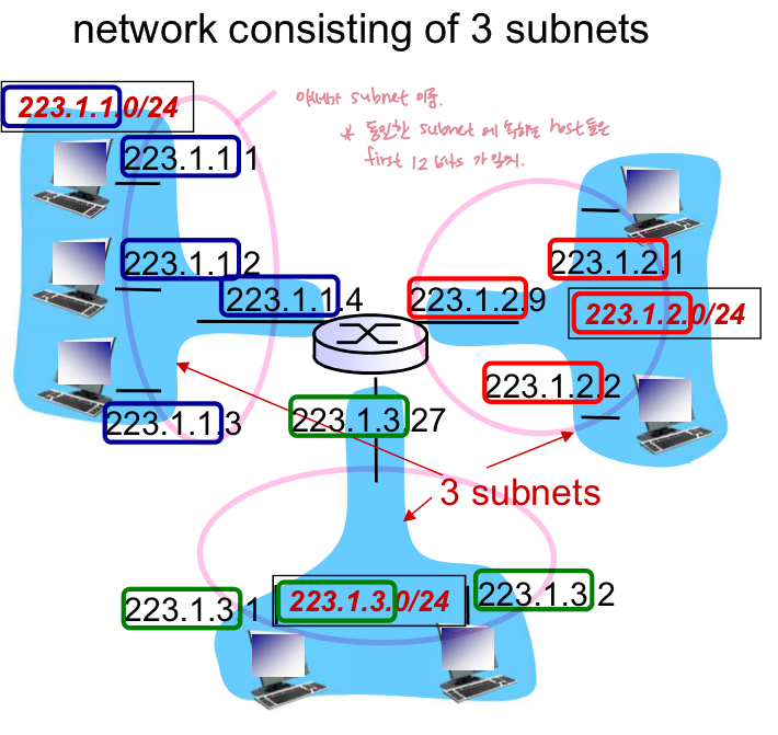 - subnet이란? : IP주소의 동일한 서브넷 부분을 가진 장치 인터페이스는 라우터의 개입 없이 물리적으로 서로 연결할 수 있다.