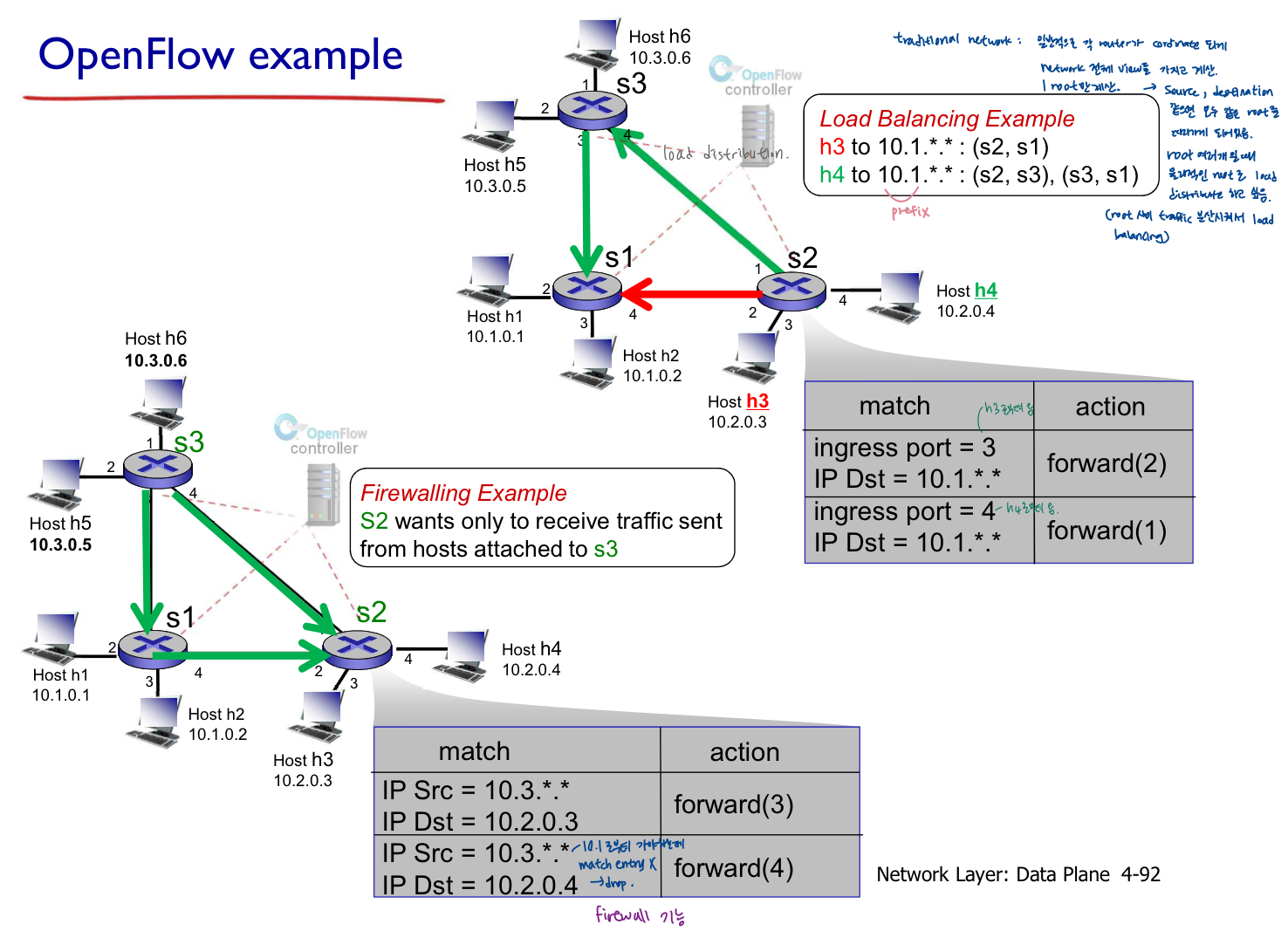 - controller도 flowtable 잘 조직해서 특정 root 따라 목적지까지 갈 수 있도록 한다.(forwarding시 특정 root로 (S1, S2)전달되도록 함 -> traditional distributed routing이 하는 것보다 좀 더 할 수 o, (route inforce)
