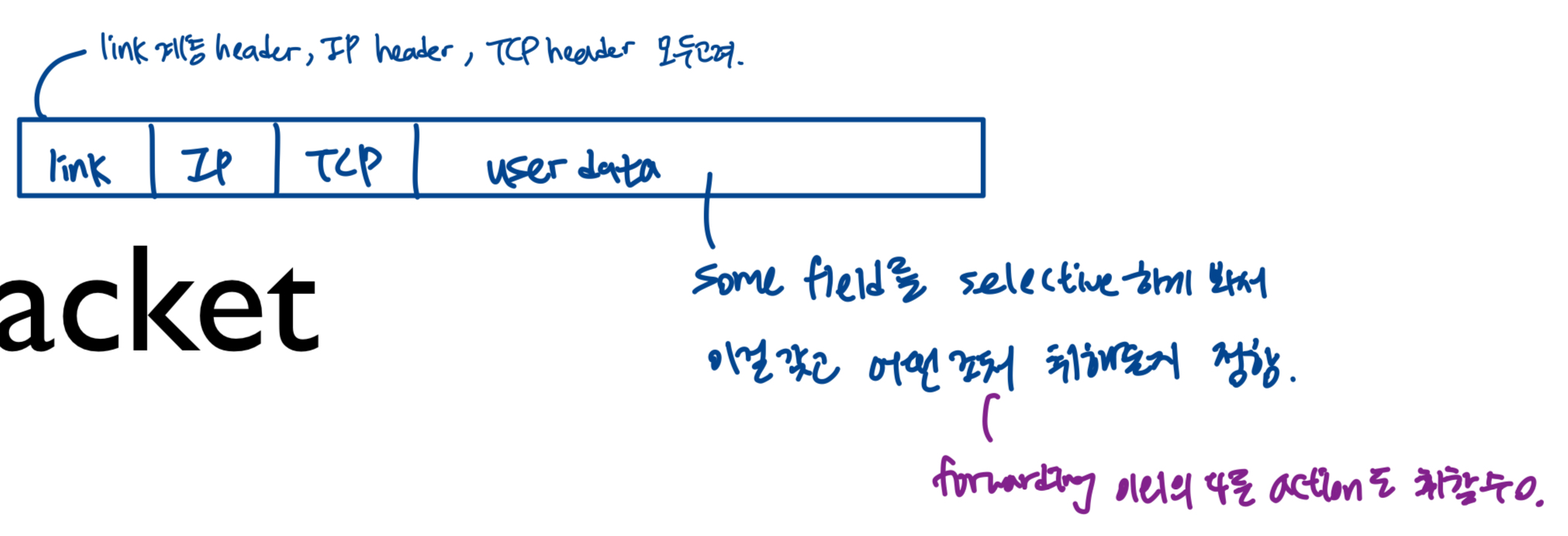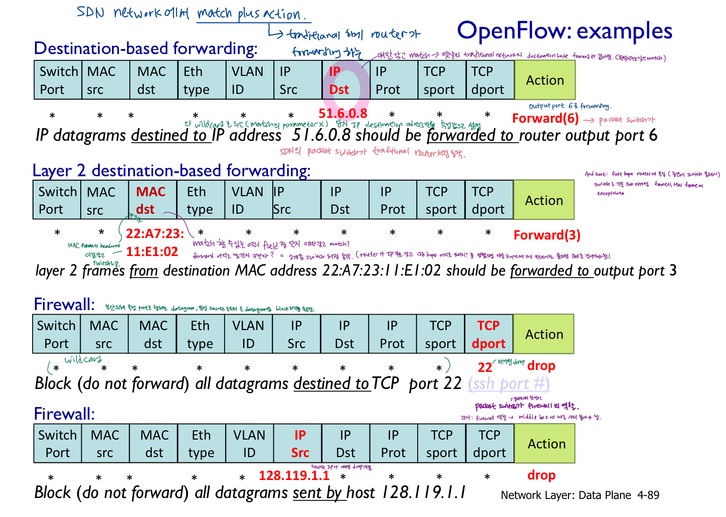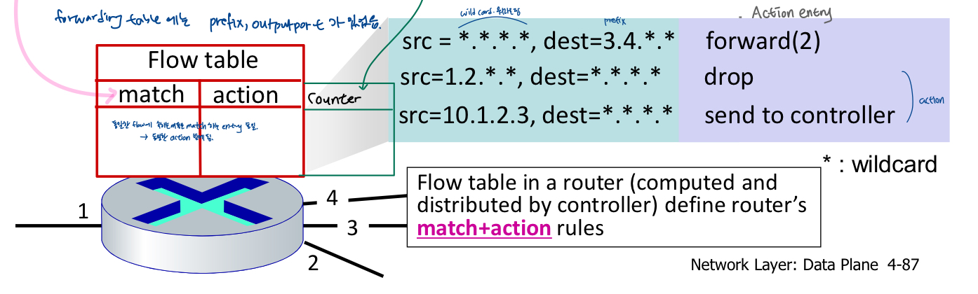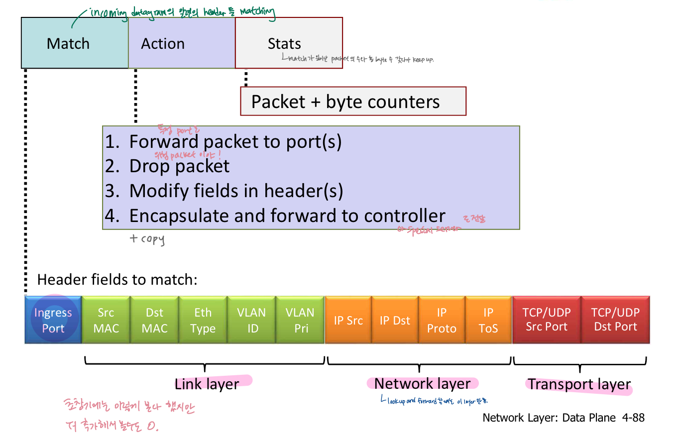 - actions: matched 패킷에 대해: block/drop, forward, modify(header의 certain field modify), send to a controller(flow table 생성해서 packet switch들에게 내려보냄, in SDN)/special server(packet을 받아서 certain objective를 가지고 bit packet 점검)