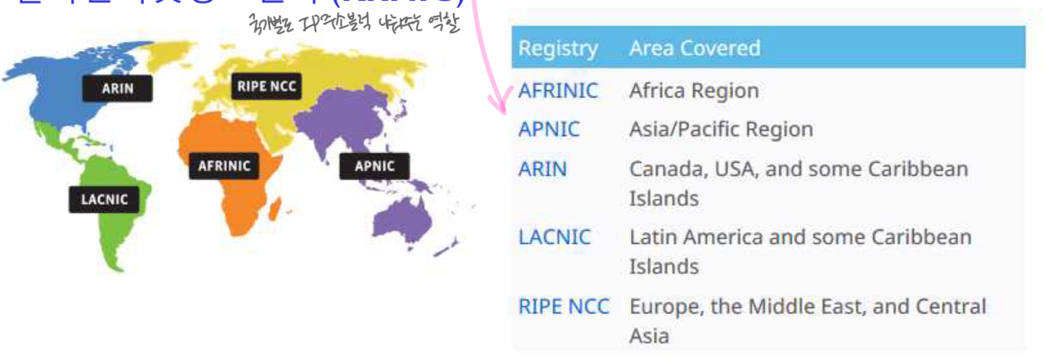 - ex. 우리학교로 치면 정보통신처라는 중앙부처에 data 신청, IP주소 하나 주세요 ! 하면 줌.