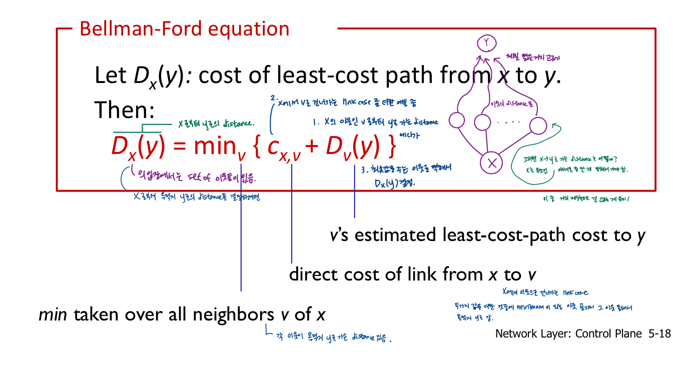 - 목적지까지 데이터그램에 잘 전달되기 위해서는 network상의 모든 router들이 다 distributed table로 자신의 own forwarding table을 build했지만 이들이 orchestrate된 view 갖고 있어야 함 -> 그래야 consistent하게 목적지 향해서 datagram이 흘러갈 수 있음.