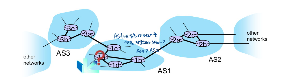 - intra-AS는 internal 목적지에 대해 entries 세팅 - 얘만 이용해서 forwarding table entry setting
