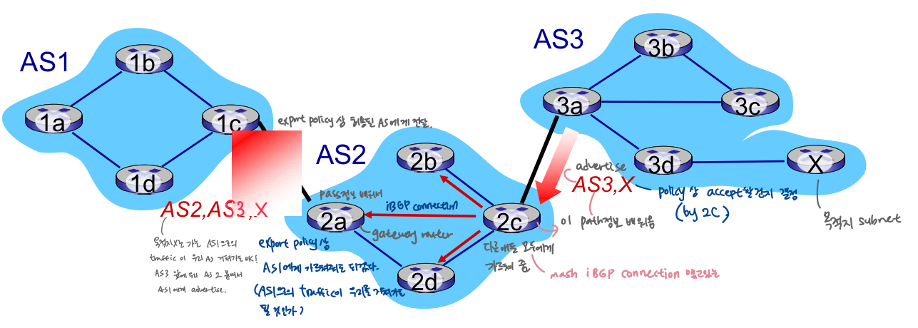 - AS2 정책에 따라 AS2라우터 2a가 경로 AS2, AS3, X를 AS1라우터 1c에 (eBGP를 통해)알림