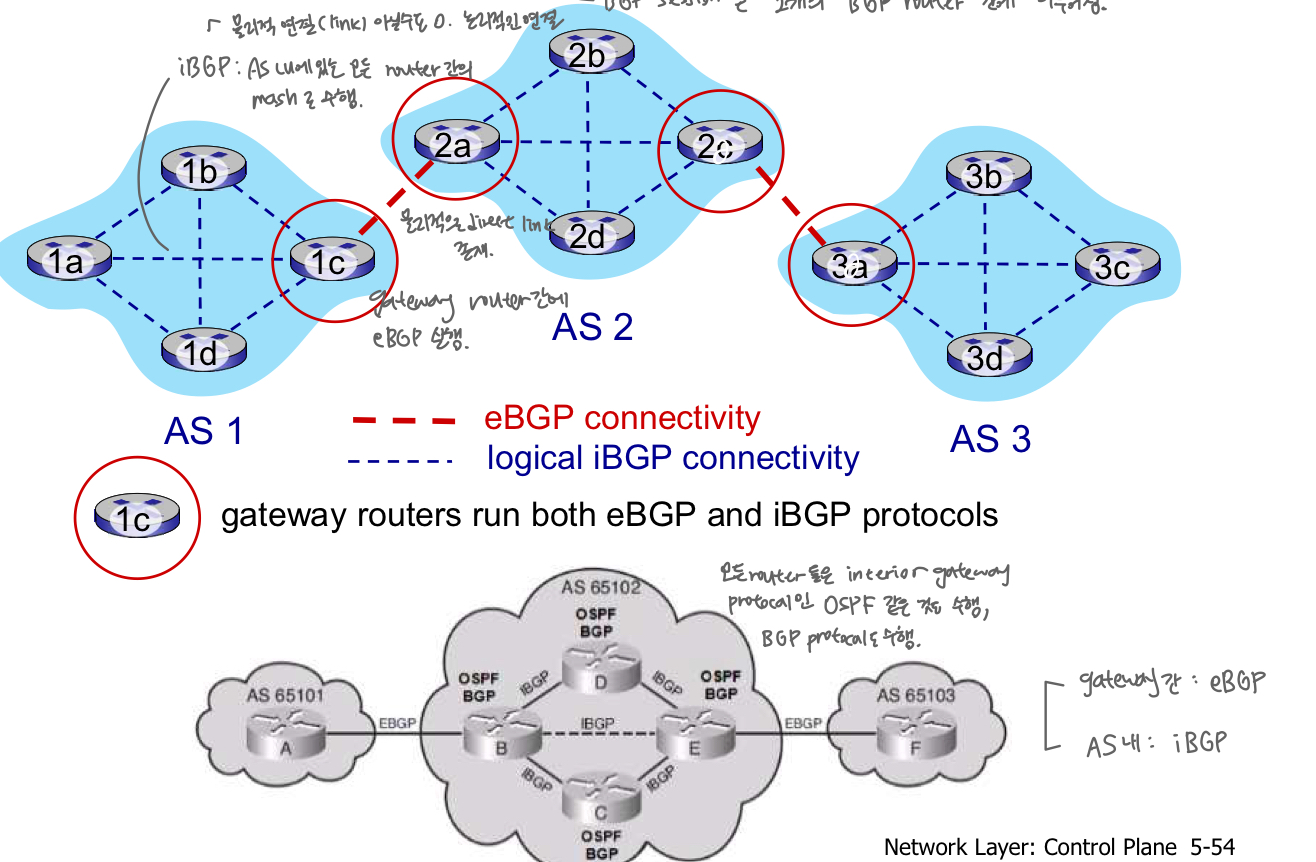 - inter-AS & intra-AS는 external 목적지에 대해 entries 세팅 - 우리 AS 바깥에 있는 애들, 정보 소문낸 router로 가기 위한 internal 경로 파악-> 그 next hope router을 forwarding table의 next hope router로 결정