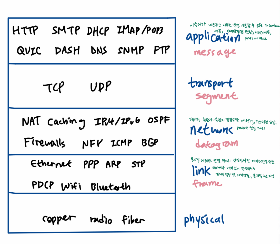 - 예시네트워크: 구식이더넷(최초의 상용 LAN)(transmission medium의 tap으로 host들이 다 연결, 전달 이더넷 링크에 연결된 모든 호스트들이 링크 공유= shared medium), 무선LAN(와이파이-share, broadcast 네트워크: 공유하기 때문에 느려짐), 위성네트워크, 하이브리드 광섬유-동축 케이블(HFC)(케이블 회사들이 케이블 갖고 인터넷 access 제공, 여러 home이 같은 내용 받아야 함 -> 하나의 링크에 같은 내용 내보내는 게 유리-link에 붙어있는 홈들이 공통으로 받아볼 수 있게-shared medium), 토큰링, FDDI(토큰 발달)