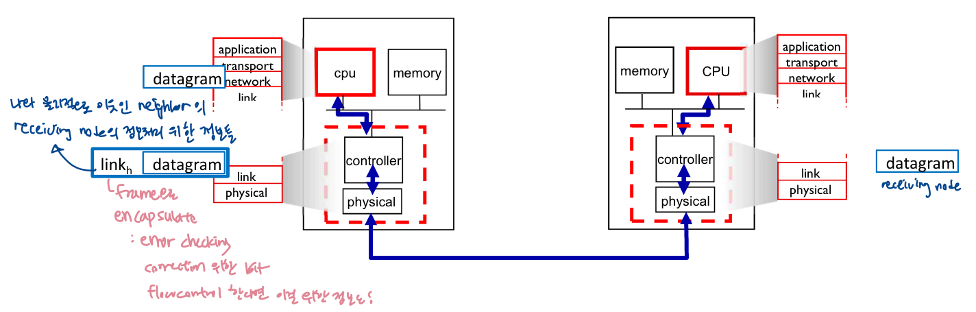 - 네트워크상 모든 노드에 링크계층 들어감. host, router 둘 다 full 버전 들어가있음