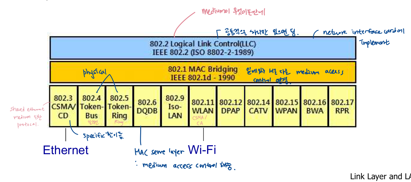 - 예시 프로토콜(프로토콜가족): IEEE 802.3/4/5/11