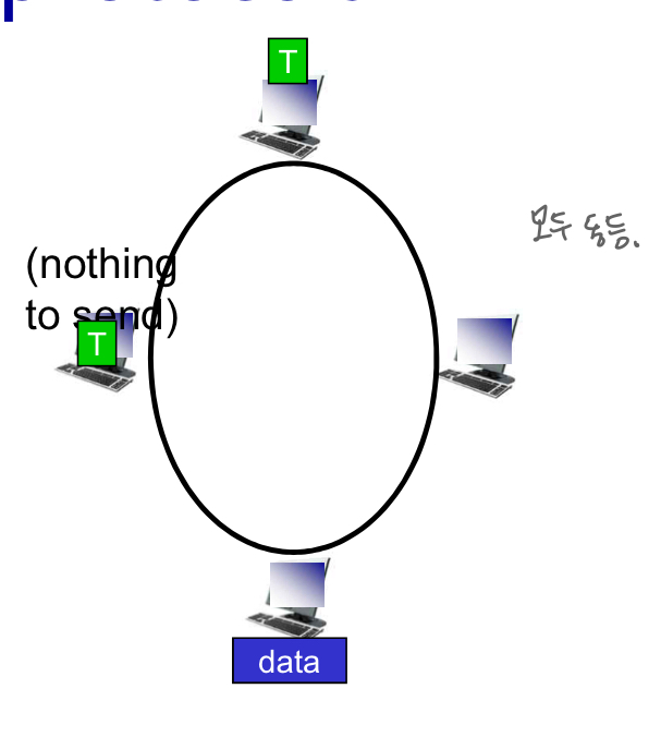 - taking turns(교대: 장점만을 합쳐서.): (폴링, 토큰 패싱-시간별로 돌아가면서 사용), 블루투스, FDDI, 토큰 링