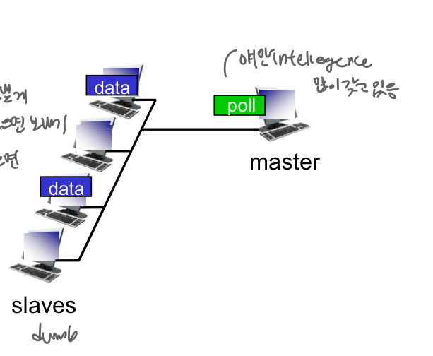 - 마스터노드가 다른 노드를 차례로 전송하도록 초대함(돌아가며 slave polling->보낼 게 있으면 대답, 없으면 대답x. EX 블루투스
