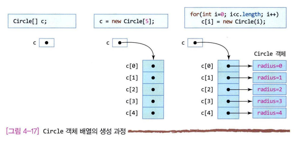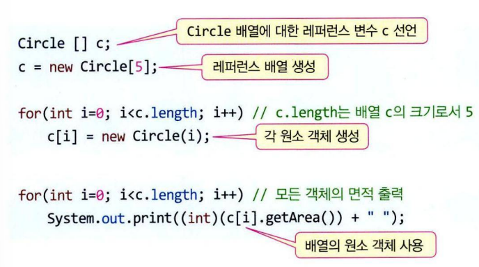- 이렇게 배열의 크기만큼 Circle 객체를 생성하여 레퍼런스 배열에 하나씩 대입하면 비로소 Circle 객체배열 생성.