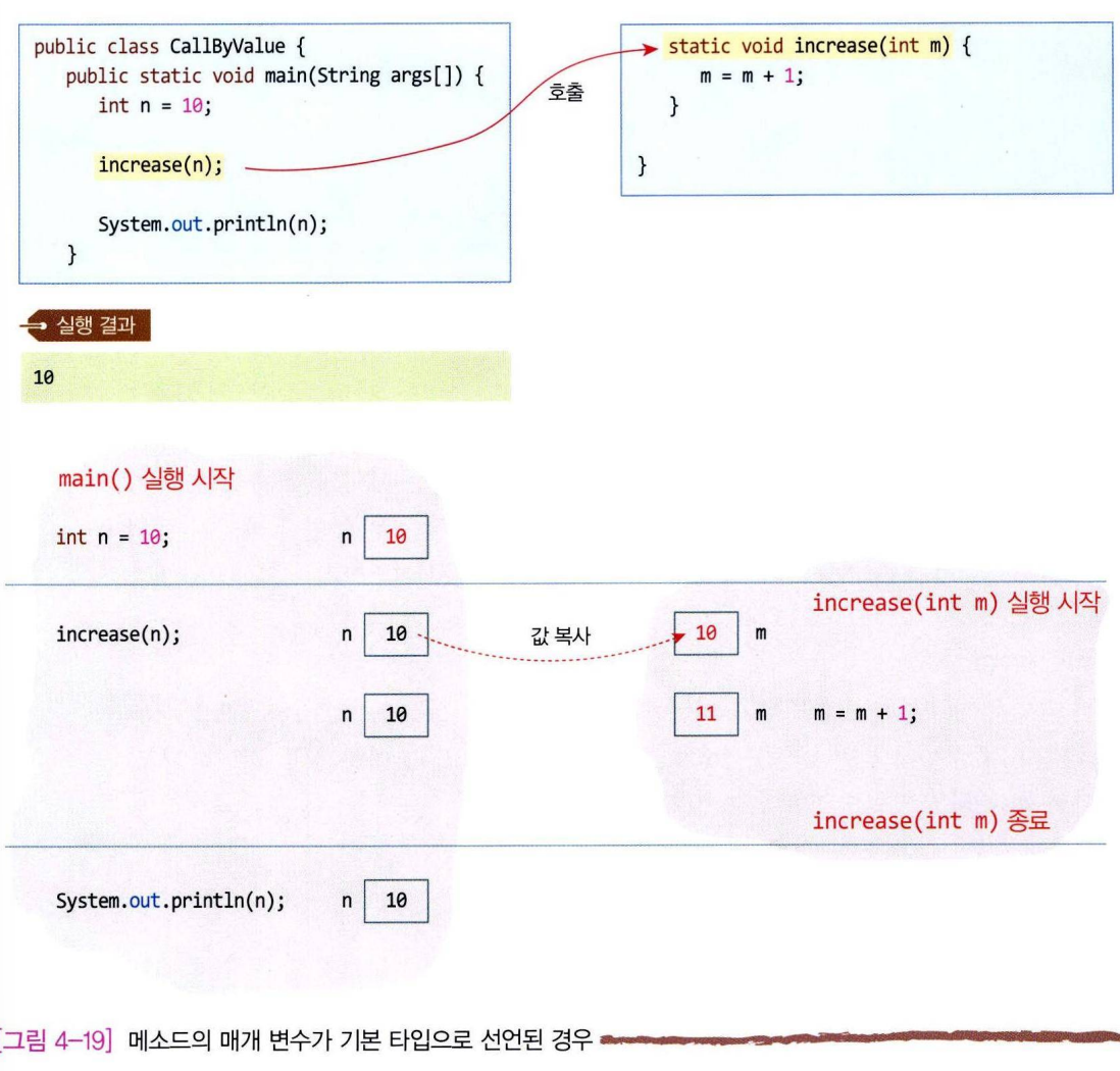 - 매개변수가 byte, char, int, double 등 기본타입으로 선언되는 경우 : 호출자(caller)가 건네는 값이 메소드의 매개변수에 전달됨