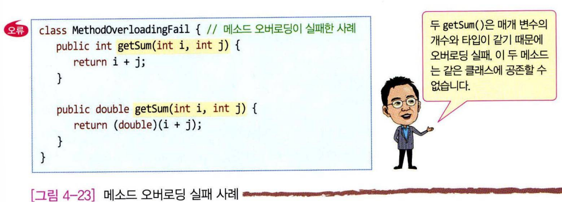 - 오버로딩 실패 : 자바 컴파일러에 의해 판단. 실패하면 컴파일오류 발생