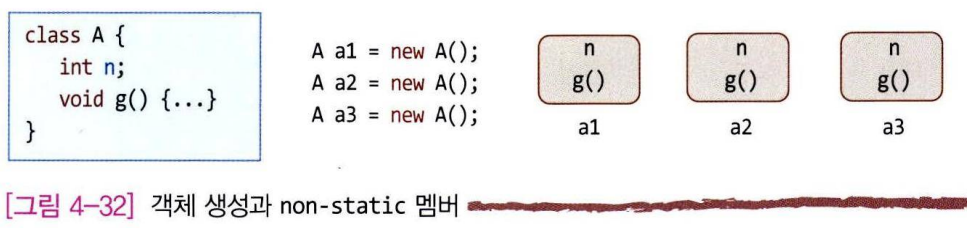 - non-static 멤버는 각 객체마다 별도로 생기므로 인스턴스 멤버라고 부름