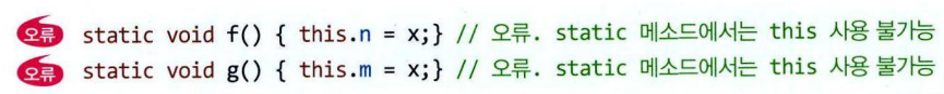 - static 메소드는 객체 없이도 존재 -> static 메소드에서 this 사용불가.