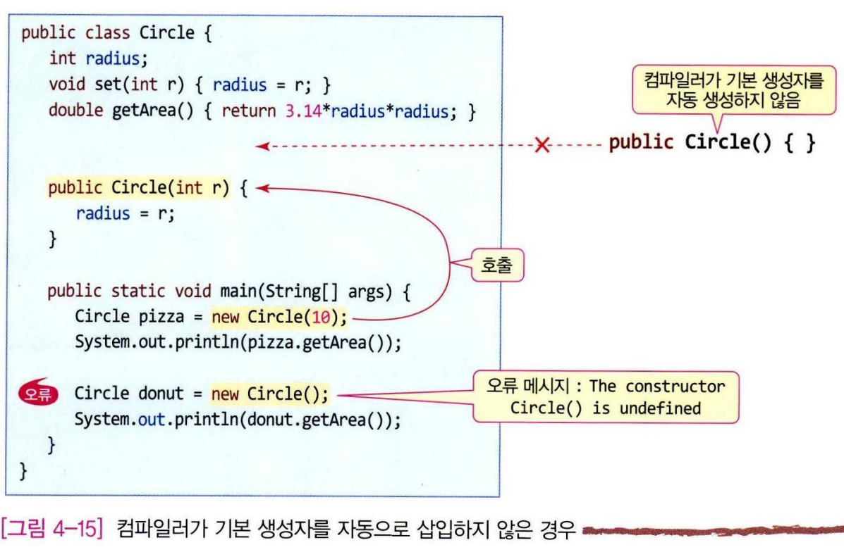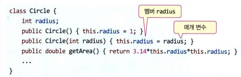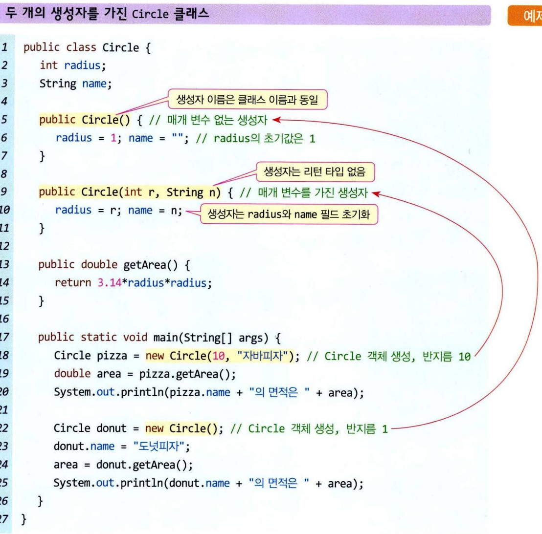 - ex. Circle pizza = new Circle (10,"자바피자"); / Circle donut=new Circle();
