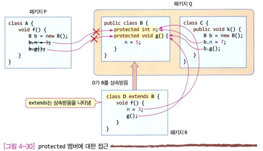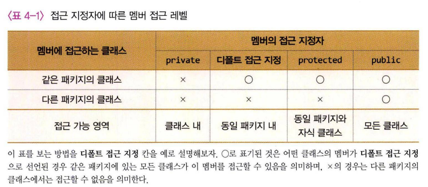 - 멤버에 대한 공개 범위 : private < 디폴트 < protected < public