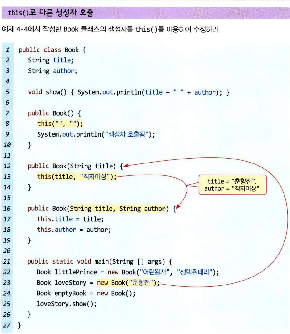 - this()는 반드시 같은 클래스의 다른 생성자를 호출할 때 사용