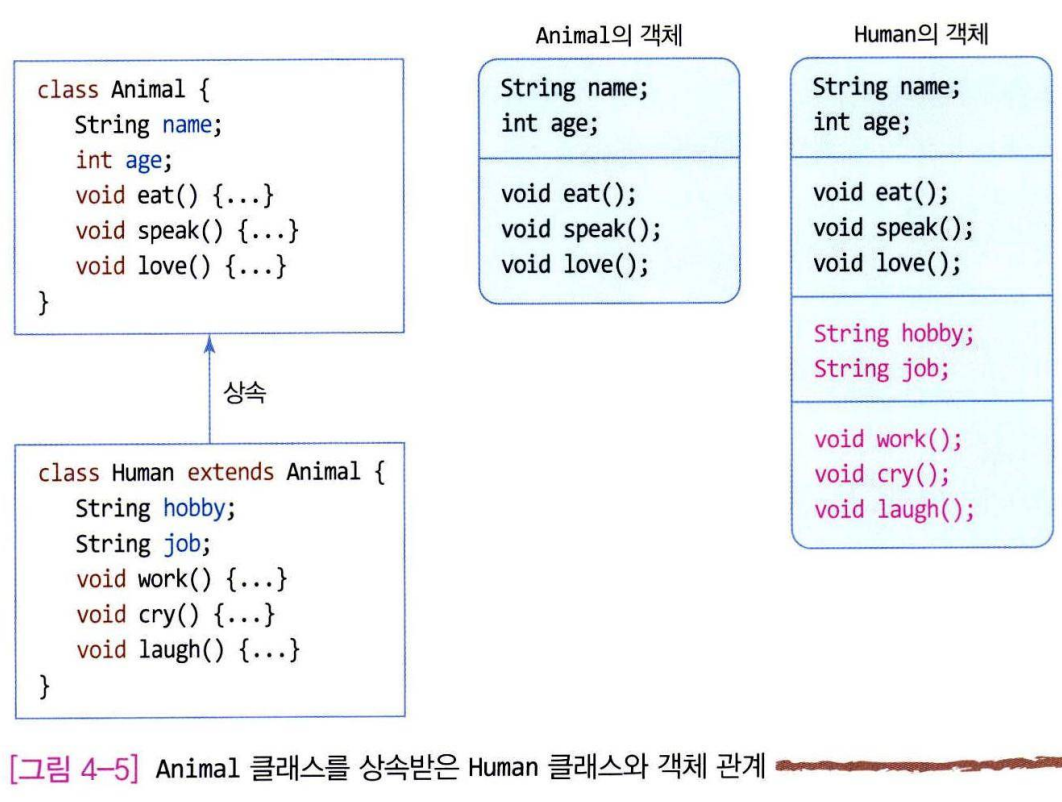 - 슈퍼클래스에 만들어진 필드와 메소드를 물려받음 -> 코드 중복작성 방지.